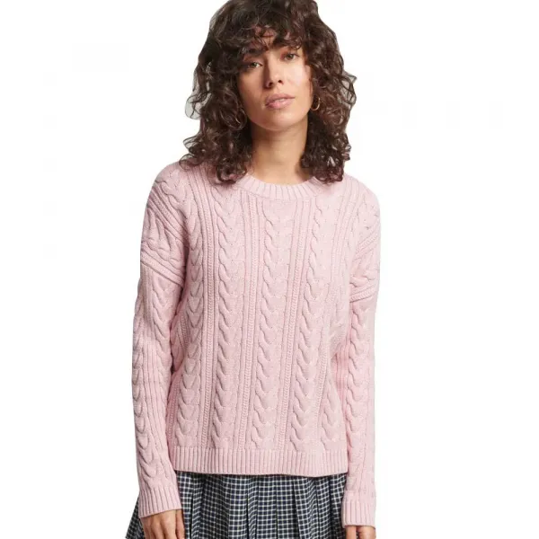 케이블 니트 디자인, 골지 넥과 밑단, 드롭 숄더, 시그니처 로고 탭.
