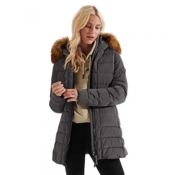 중간 길이 디자인, 지퍼 잠금, 조절 가능한 인조 모피 트리밍 및 Superdry 브랜딩이 특징인 재활용 폴리에스테르 충전재 패딩 코트.