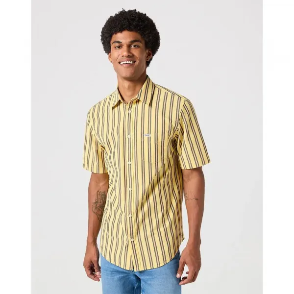 버튼다운 프론트, 스프레드 칼라, 와일드 랭글러 로고가 있는 가슴 주머니가 특징인 이 셔츠는 기능적인 디자인과 아이코닉한 브랜딩을 결합했습니다.