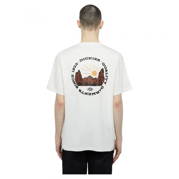 100% 코튼으로 만들어졌으며, 앞 가슴에는 아치형 웨스턴 디키스 로고가, 뒷면에는 큰 원형 산맥 그래픽이, 밑단에는 짠 디키스 라벨이 있습니다.