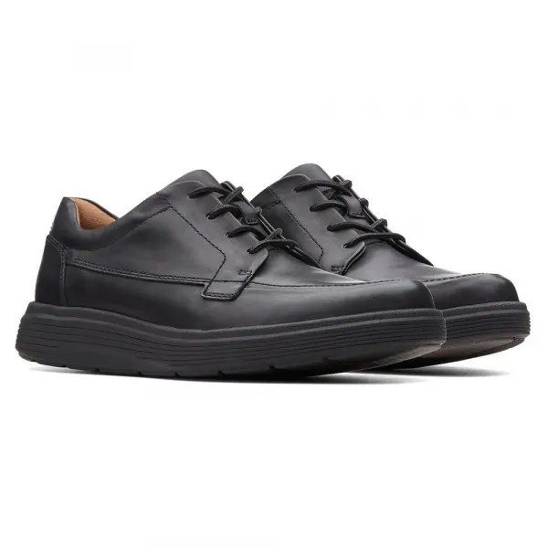 갑피는 블랙 가죽으로 제작되었으며 섬세한 스티치 장식이 특징입니다.