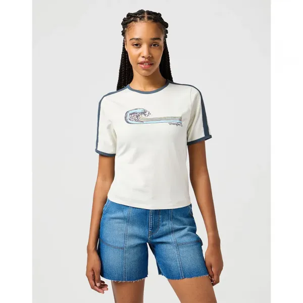 가슴 부분에 서핑 그래픽이 있으며, 소매와 밑단까지 이어지는 링거 디테일이 특징입니다.