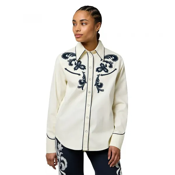 아플리케 자수로 고급스러움을 더하고 부드럽고 약간 더 두꺼운 도비 면 소재로 제작된 이 웨스턴 스타일 셔츠는 착용감이 뛰어납니다.