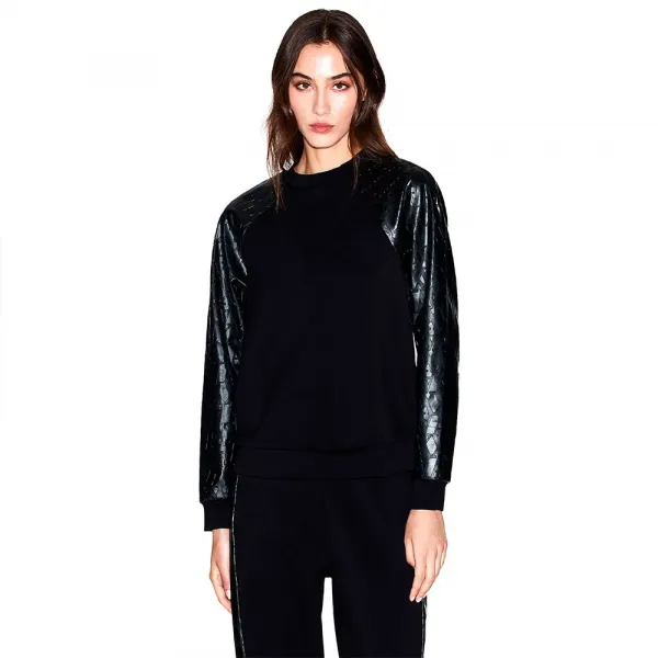 스웨트셔츠의 메인 바디는 깔끔하고 클래식한 캔버스를 제공하며, 에코 레더 레글런 소매는 반항적인 시크함을 더합니다.