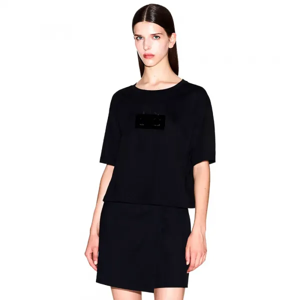 --- 기술 사양 및 세부 정보: 제품 모델: XW001385_AF10356 카테고리: 의류 하위 카테고리: 티셔츠 성별: 여성 소재: 면 패턴: 전면 로고 디테일이 있는 무지 네크라인: 라운드 소매 길이: 반팔 핏: 크롭 크루넥 반팔 크롭 핏 티셔츠 앞판에 광택 있는 톤온톤 AX 나이트 랩 로고.