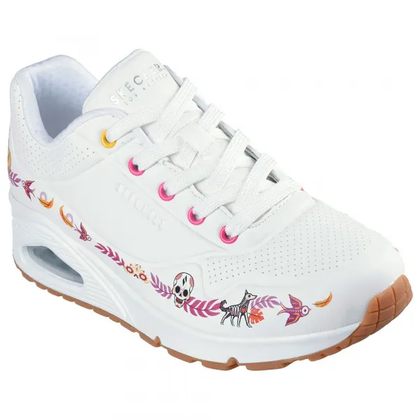 주요 특징: - 스케쳐스 죽은 자의 날 컬렉션 - 스케쳐스 에어 쿨 메모리 폼® 쿠션 컴포트 인솔 - 스케치-에어® 보이는 에어백 미드솔 - 특별판 포장 디자인 세부 정보: - 미드솔을 따라 축제 모티프가 있는 매끄러운 듀라레더 갑피 - 칼라베라 해골 레이스 참이 있는 레이스업 패션 스니커즈 - 유연한 접지 아웃솔 - 1 1/2인치 힐 높이 - 스케쳐스® 로고 디테일 기술: 에어 쿨 메모리 폼: - 스케쳐스 에어 쿨 메모리 폼®은 압력 완화, 즉각적인 편안함 및 통기성을 제공합니다.