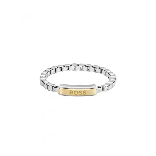 디자인의 핵심은 꼼꼼하게 제작된 스테인리스 스틸 링크 팔찌와 옐로우 골드 도금 스테인리스 스틸 플레이트이며, BOSS 로고가 새겨져 있습니다.