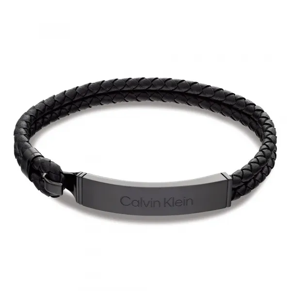 디자인은 CK 로고가 새겨진 질감 있는 메탈 바가 있는 아름답게 짜여진 블랙 가죽 팔찌를 중심으로 합니다.