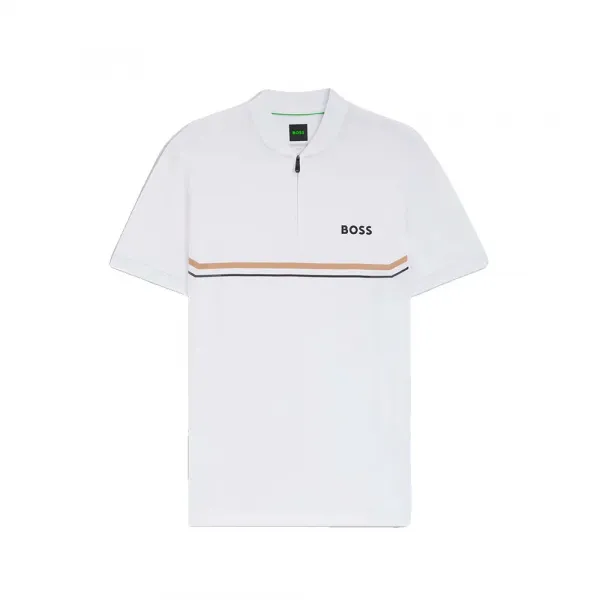 특징: - 슬림핏 - 네크라인: 플랫 니트 칼라 - 상단 잠금: 지퍼 잠금 - 반팔 - 플랫 니트 커프스 - 옆트임 - 표준 길이 사양: - 소재: 폴리에스터 100% 관리: - 찬물에 약하게 세탁 - 표백제 사용 금지 - 건조기 사용 금지 - 낮은 온도로 다림질 - 드라이클리닝 금지
