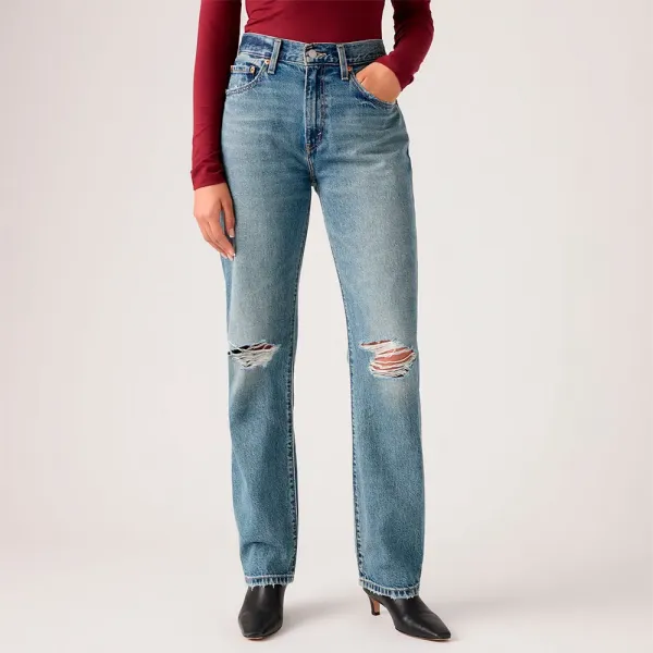 하이 라이즈, 딱 적당한 편안한 핏, 완벽하게 스트레이트 레그로 디자인된 이지 대드 진을 선보입니다.