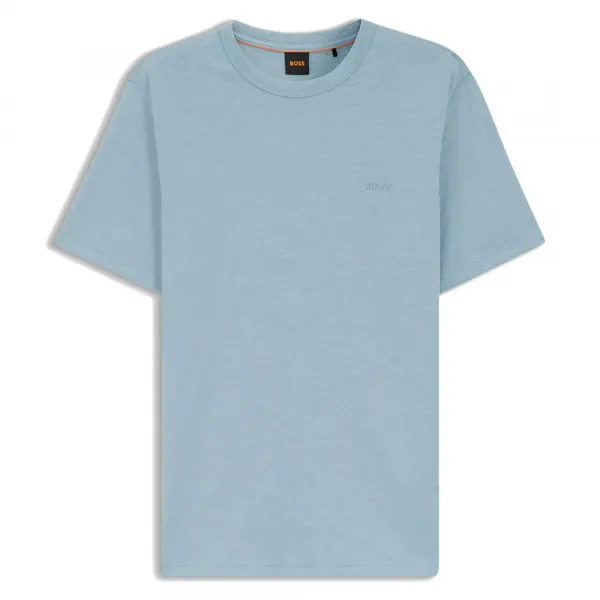 목 부분에 칼라 바인딩 디테일이 있는 기본 티셔츠.