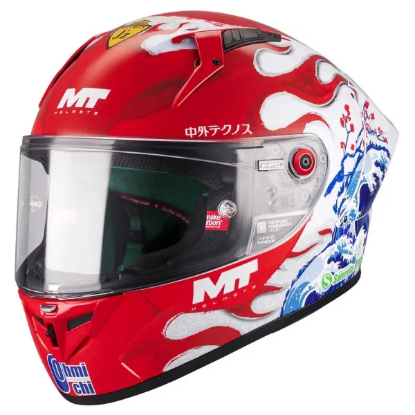 특징: MT KRE+ S는 100% 스포츠 헬멧으로, 카본 파이버로 제작되었으며 FIM 공인 인증을 받아 모든 국제 대회에 참가할 수 있습니다.