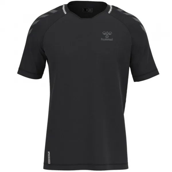 이 hummel? 모델의 네크라인을 따라 우븐 스트라이프가 특징이며, 헤링본 패턴으로 장식된 짧은 래글런 소매가 있습니다.
