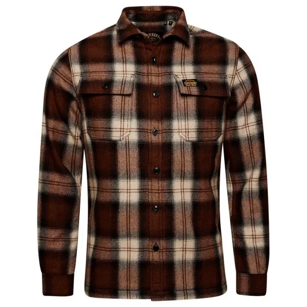 울 혼방, 스탠다드 칼라, 버튼 잠금, 두 개의 버튼 포켓, 버튼 잠금 커프스, 보르 안감 바디, 가슴 포켓과 하단 플라켓에 Superdry 패치.
