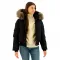 탈부착 가능한 인조 모피 트리밍과 번지 코드 조절기가 달린 후드.