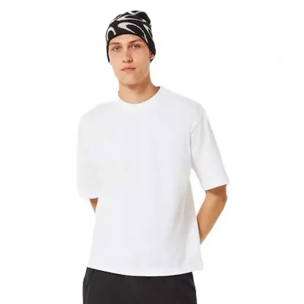 특징: - 면 저지 티셔츠 - 스티치 처리된 넥테이프 - 골지 칼라 - 소매와 밑단에 이중 스티치 - 가슴 부분의 톤온톤 플록 프린트 오클리 바크 로고 - 피치 가공 - 박시핏 사양: - 소재: 100% BCI 면 피치 가공