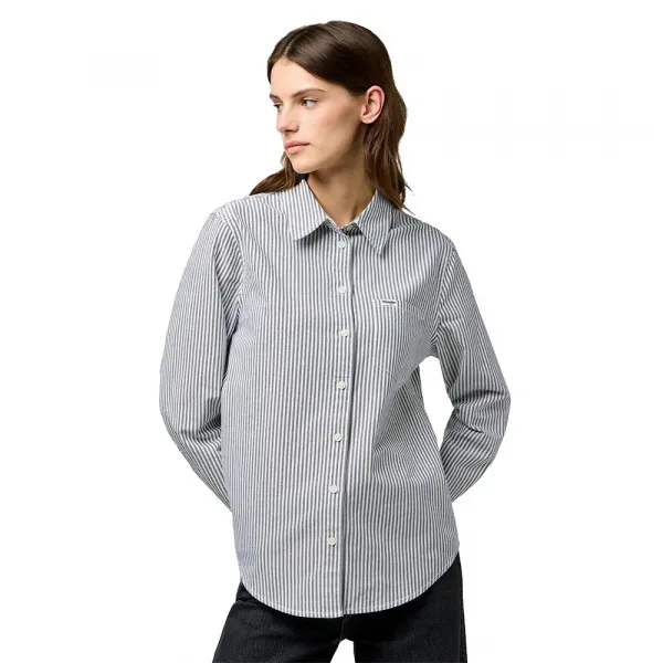뾰족한 칼라, 버튼 커프스, 시그니처 우븐 Wrangler 라벨이 있는 싱글 가슴 포켓이 특징입니다.