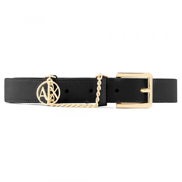 벨트에는 ´AX´라는 글자가 새겨진 작은 금색 참이 달려 있으며, 이는 벨트 브랜드인 아르마니 익스체인지를 나타내는 것으로 보입니다.