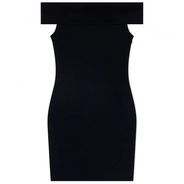 오프숄더 바디콘, 일반 기장, 왼쪽 사이드 지퍼, 뒷면에 로고 장식