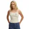 스파게티 스트랩과 스쿱 넥라인, 레이스 트리밍.