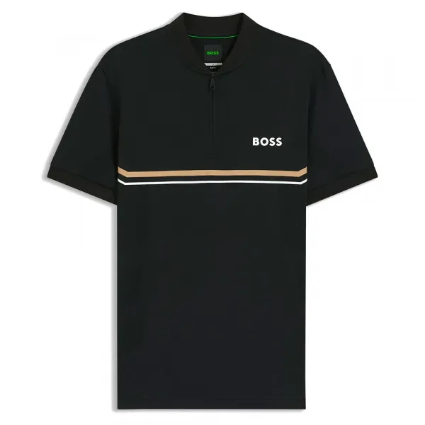 특징: - 슬림핏 - 네크라인: 플랫 니트 칼라 - 상단 잠금: 지퍼 잠금 - 반팔 - 플랫 니트 커프스 - 옆트임 - 표준 길이 사양: - 소재: 폴리에스터 100% 관리: - 찬물에 약하게 세탁 - 표백제 사용 금지 - 건조기 사용 금지 - 낮은 온도로 다림질 - 드라이클리닝 금지