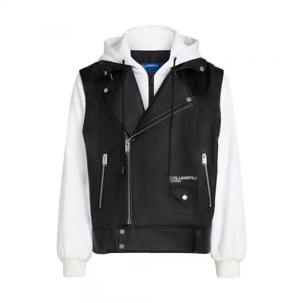바이커 재킷에서 영감을 받은 실루엣에 대비되는 질감과 카를 라거펠트 진의 시그니처 디테일을 더해 자신감 넘치는 스트리트 스타일을 완성하는 혼합 소재 재킷입니다