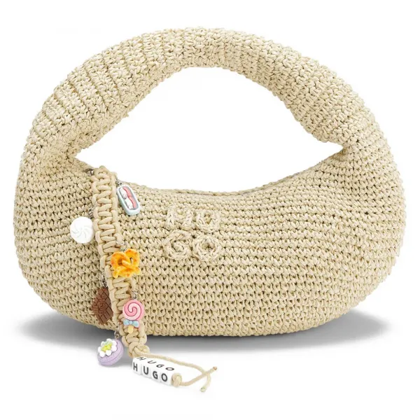 폴리에스터 꼰 재질과 플라스틱 참 7개(휴고 로고가 있는 단일 큐브 포함)가 달린 참 지퍼 풀러.