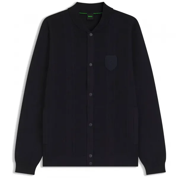 중앙 앞면 스냅 단추가 있는 보머 재킷 스타일.