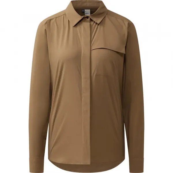 전면 단추 여밈, 가슴 주머니, 롤업 소매가 특징입니다