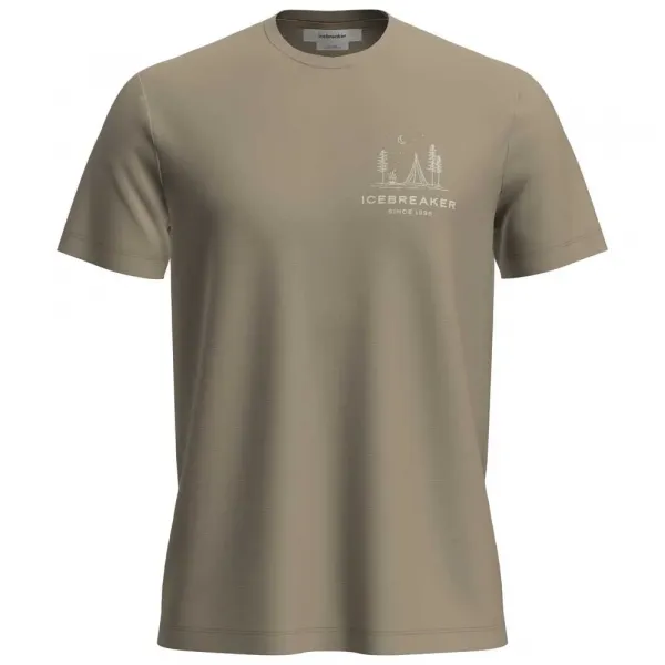 이 티셔츠의 독창적인 그래픽 아트워크는 맑은 밤하늘 아래 숲 속 캠핑장의 순진한 스타일 일러스트를 특징으로 합니다.