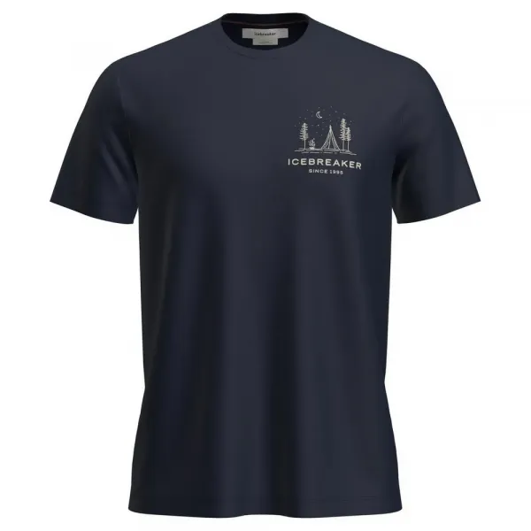 티셔츠의 독창적인 그래픽 아트워크는 맑은 밤하늘 아래 숲 속 캠핑장의 순수한 스타일 일러스트레이션을 특징으로 합니다.