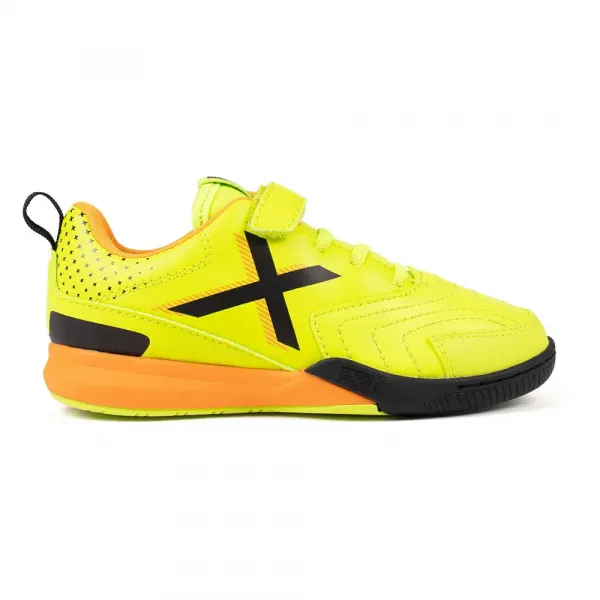 이 모델은 신축성 있는 끈과 벨크로 스트랩을 결합하여 독립적인 착용을 촉진하는 기능성으로 돋보이며, 격렬한 실내 축구 훈련, 학교 체육 수업, 또는 공원에서 안전하게 경기를 즐기려는 아이들에게 이상적인 신발입니다