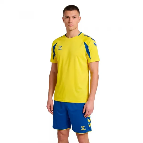 The jersey has raglan sleeves to improve range of motion, contrast panels on the shoulders, and iconic hummel chevrons on the sleeves, highlighting the teamsport look.