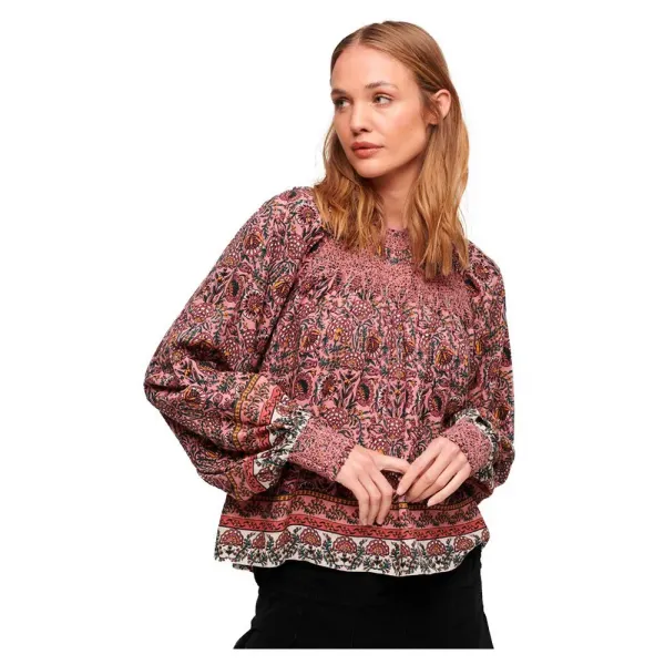 평소 사이즈로 가세요, 올오버 플로럴 프린트, 새틴 트림이 있는 둥근 네크라인, 뒤쪽 버튼 잠금 및 키홀 디자인, 스모킹 어깨 패널, 풍선 소매, 스모킹 커프스, 은은한 사이드 솔기 로고 탭.