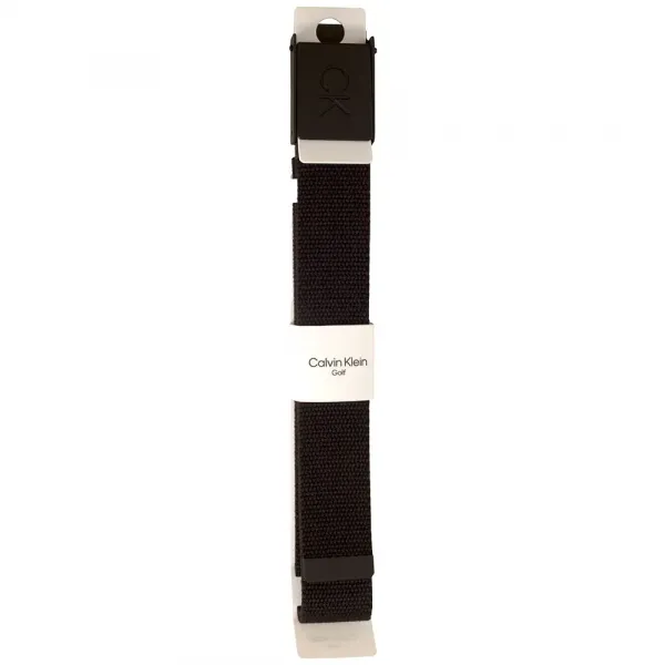 CK 버클 디테일과 무광 블랙 엠보싱 로고로 마감된 캘빈 클라인 골프 벨트.