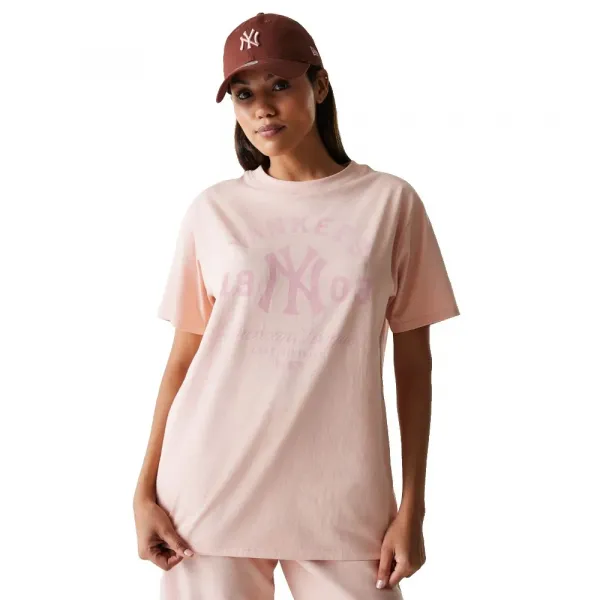 상징적인 뉴욕 양키스 로고 워드마크는 셔츠의 기본 색상과 조화를 이루는 색상 팔레트를 사용하여 미묘하고 세련된 "스탬프" 스타일로 전면에 새겨져 있습니다.