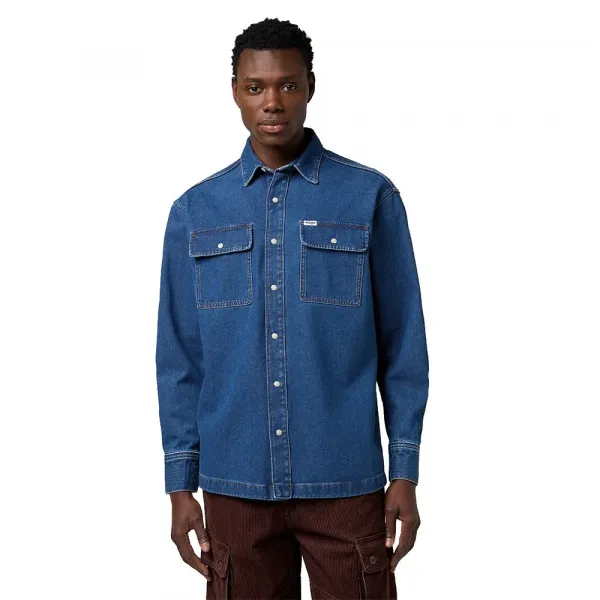 직조된 Wrangler 라벨이 있는 플랩 포켓 2개, 스트레이트 밑단, 스냅 단추로 마감되었습니다.