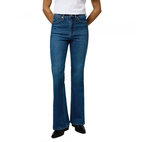 특징: 와이드 레그, 미드 라이즈 웨이스트, 플레어 부츠컷 디자인.