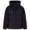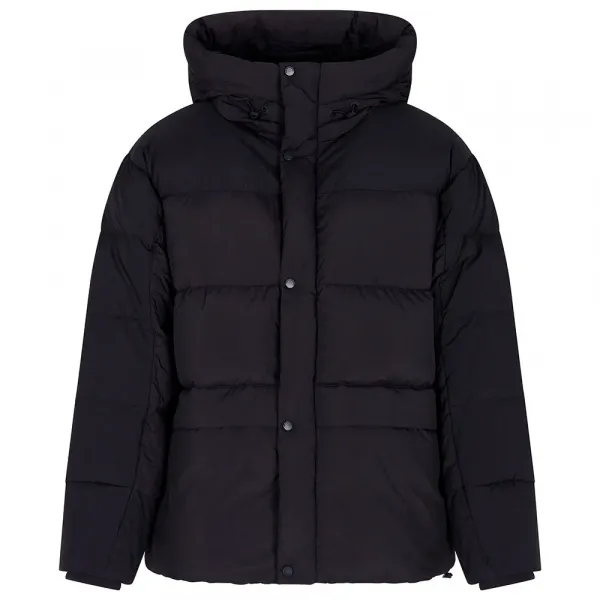 --- 풀 집업 후드형 리얼 다운 재킷, 드로스트링이 있는 하이넥, 스냅 버튼과 지퍼 여밈, 큰 주머니, 그리고 내부 조임끈.
