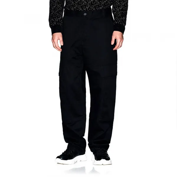 인체공학적 절개선이 있는 스트레이트 레그 카고 바지, 큰 플랩 패치 포켓, 웰트 포켓, 뒷면 메탈 로고 플레이트.