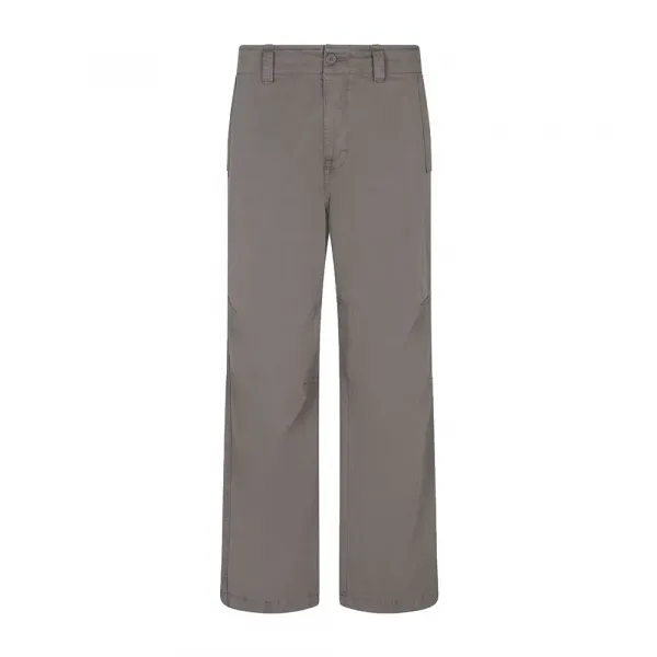 단추 여밈, 웰트 및 벨트 고리, 조절 가능한 단추, 웰트 포켓, 스트레이트 레그, 플랩 패치 포켓, 뒷면 메탈 로고 플레이트가 있는 바지.