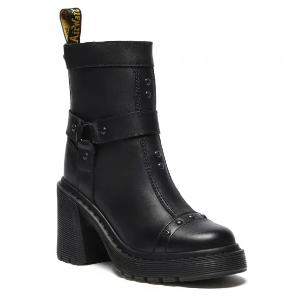 기술 사양:스타일: 하네스 디테일의 힐 풀온 첼시 부츠소재: 센달 가죽구조: 굿이어 웰트 제법, 갑피와 밑창을 열 접착 후 봉제특징: 시그니처 옐로우 웰트 스티칭 및 스크립트 AirWair 힐 루프밑창: 플레어 블록 힐과 커맨도 트레드가 있는 청키 플랫폼 밑창힐 높이: 3 3/8인치플랫폼 높이: 1 1/8인치핏: 신고 벗기 용이하고 안정적인 착용감을 위한 신축성 있는 거싯 처리
