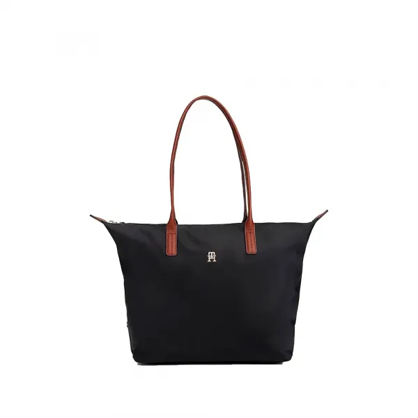 브라운 핸들이 달린 이 블랙 포페트 토트는 골드 장식과 깔끔한 라인이 특징이며, 일상적인 세련미를 더하기에 완벽합니다.
