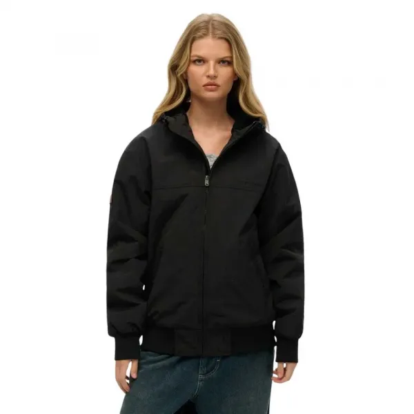 브랜딩: Superdry의 상징적인 로고 패치 및 브랜드 하드웨어 특징.