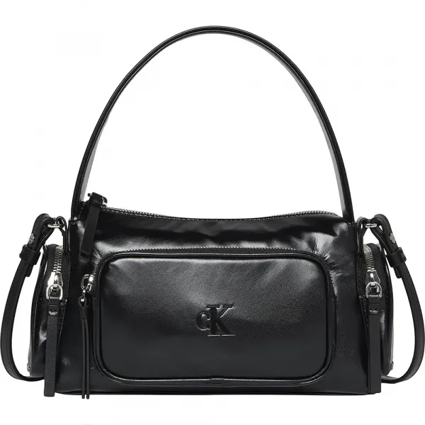전면 및 측면 포켓이 있는 여성용 Calvin Klein 더블 핸들 블랙 샤이니 나일론 백.