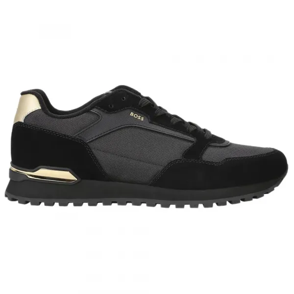 직물과 스웨이드 요소의 혼합 소재로 된 상징적인 BOSS 러닝 스니커즈.