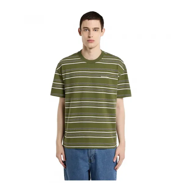 220GSM 링스펀 플렉스 코튼으로 제작되었으며, 올오버 가로 스트라이프 프린트와 왼쪽 체스트에 작게 자수된 디키스 스크립트 로고가 특징입니다.