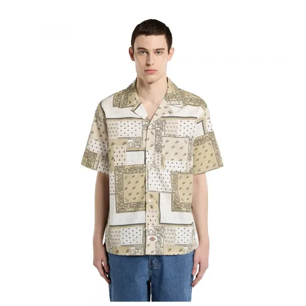 내구성이 뛰어나고 통기성이 좋은 4oz 라이오셀과 면 혼방 소재로 제작된 이 올오버 프린트 셔츠는 리버스 칼라, 왼쪽 가슴 포켓, 직조된 디키즈 헴 라벨이 특징입니다.