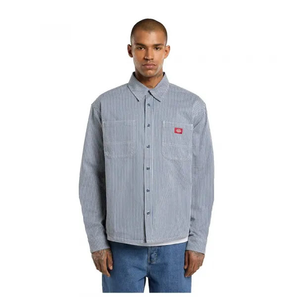 7oz 가먼트 워싱 히코리 코튼 트윌로 제작된 이 워크 셔츠는 투피스 칼라, 앞면 라운드 패치 포켓, 왼쪽 가슴 포켓에 직조된 Dickies 라벨, 플래킷이 있는 버튼업 클로저가 특징입니다.