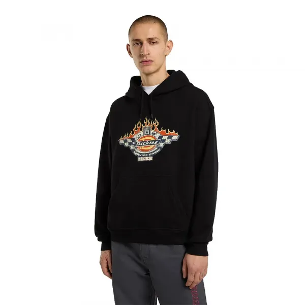 나염 처리된 420GSM 브러시백 면 플리스로 제작되었으며, 빈티지 자동차 경주 서비스 크루 전면 가슴 아트워크, 전면 캥거루 포켓, 안감이 있는 드로스트링 후드, 엮어서 만든 디키즈 사이드 심 라벨이 특징입니다.